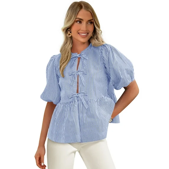 Women’s Bow Front Top with Puff Sleeves, Sizes S-XXL